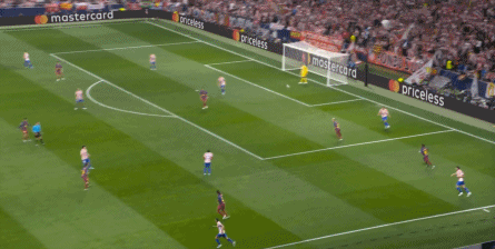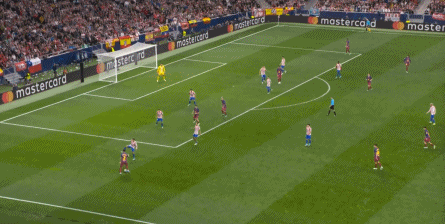 然后在第31分钟,马竞后场出球,格列兹曼和略伦特做了一次非常漂亮的传跑配合,后卫跟不上格列兹曼,后腰追不上略伦特,成功打穿了巴塞罗那的防线,这次右路传中,卢克曼可以直接攻门: