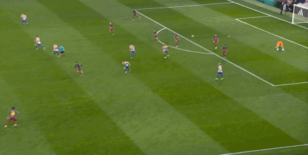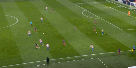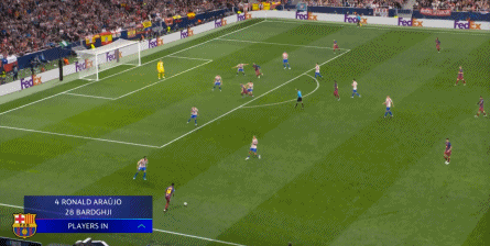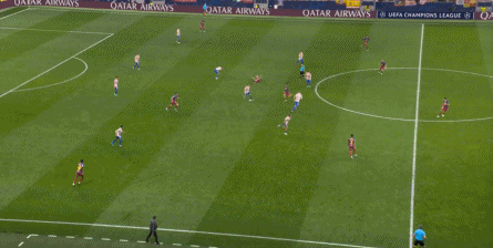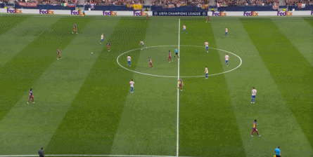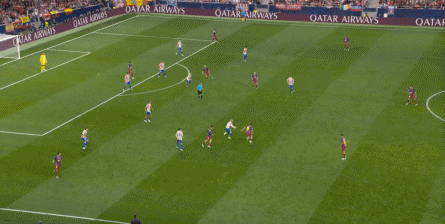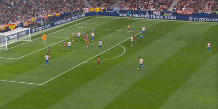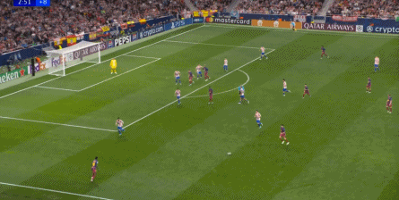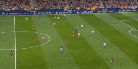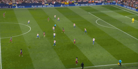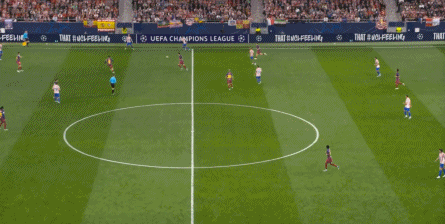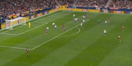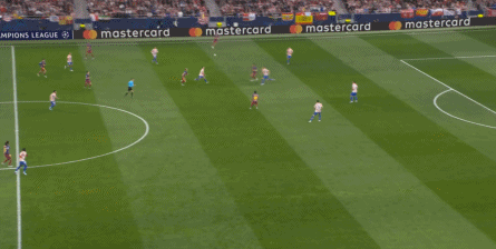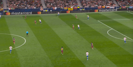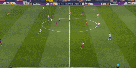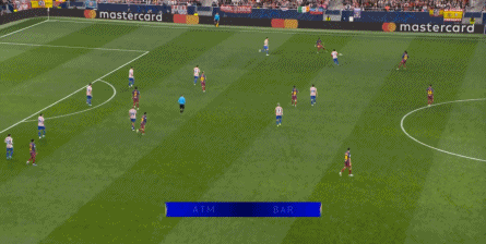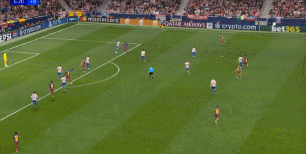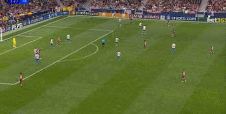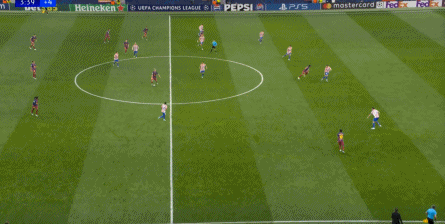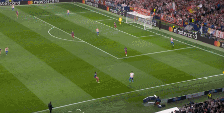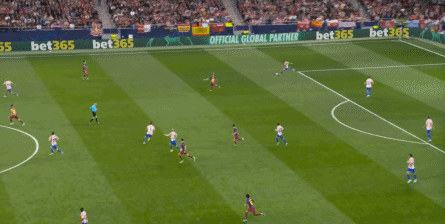 西蒙尼的球队依然精准地捕获了巴萨的高位防线的身后空间,而且在前场还获得了清晰的拼脚优势,这让他们一直领先半个身位的优势。